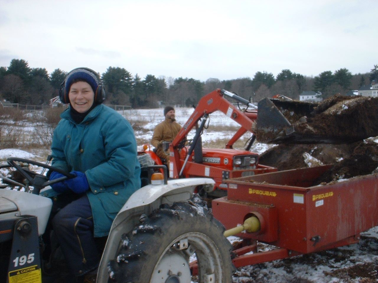 Cover crops help us begin to replace the tons (literally!) of organic matter taken from the fields during the growing season. Tons (again, literally!) of compost will also need to be spread before the next growing season if we are to even approach replenishing the soil. As you may be able to tell from this old photo of me spreading compost with CY at Vanguarden CSA, I like this winter work!