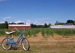That’s a blue Schwinn in front of a field of garlic; big red barn and hoop house in the background. Yep, those are blue streamers on the handle bars. On Riverland’s twenty-five acres it’s essential to have a way to get around. I’ll post more farm fleet photos soon.