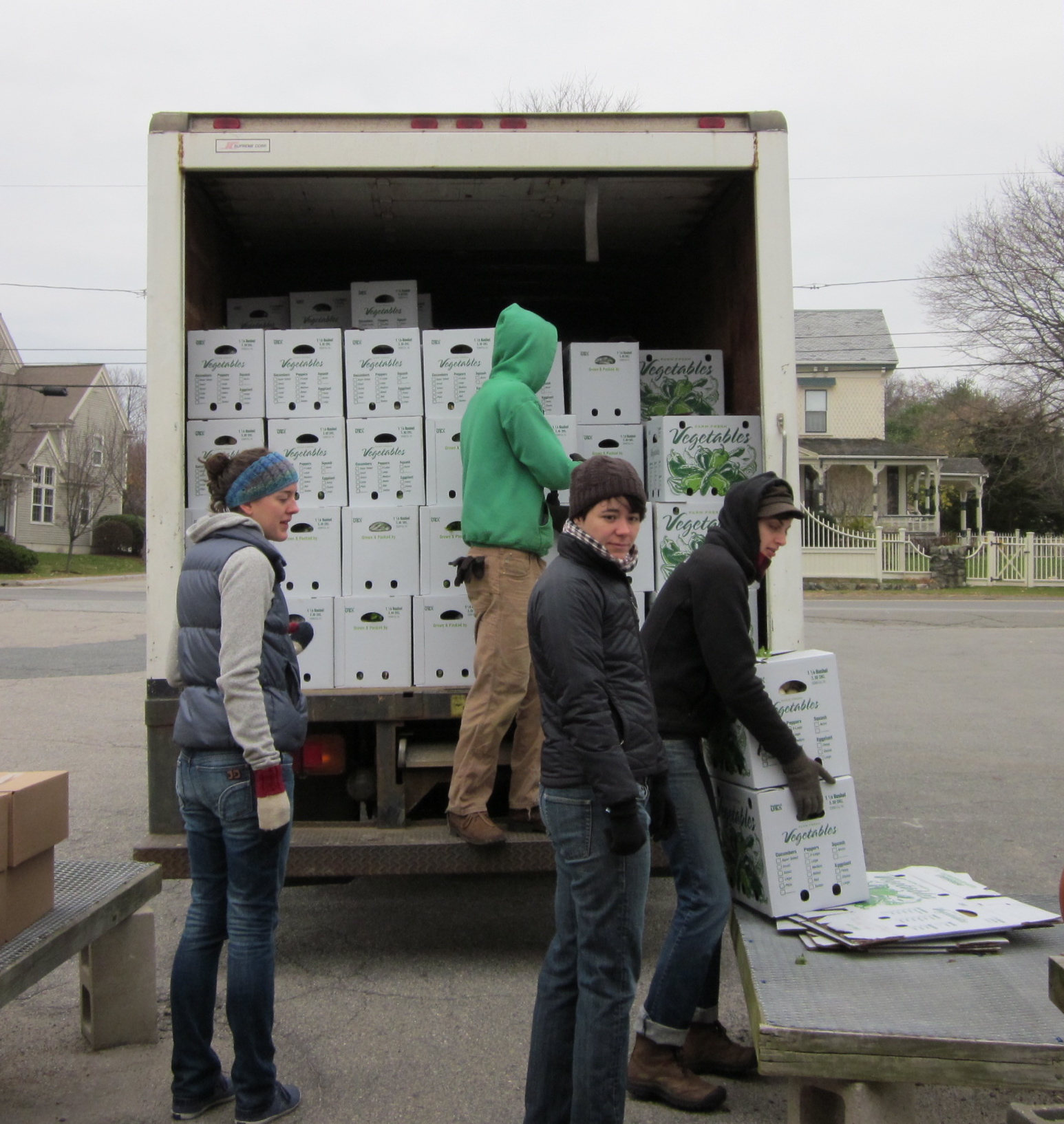 Today was the first distribution of our two month winter share. What a lovely day for a CSA share distribution – sunny skies and crisp temperatures. Lots of folks came to help unload the truck and set up for the distribution — thank you!!!