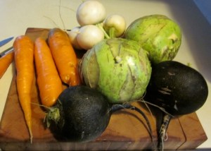 A few of the veggies in the share proved challenging to identify and “what’s this?” was a common question during the distribution. The answer: “It’s probably either kohlrabi, winter radish or parsley root.” Photos of kohlrabi and black winter radish are below; more pics if you follow the links I’ve included.
