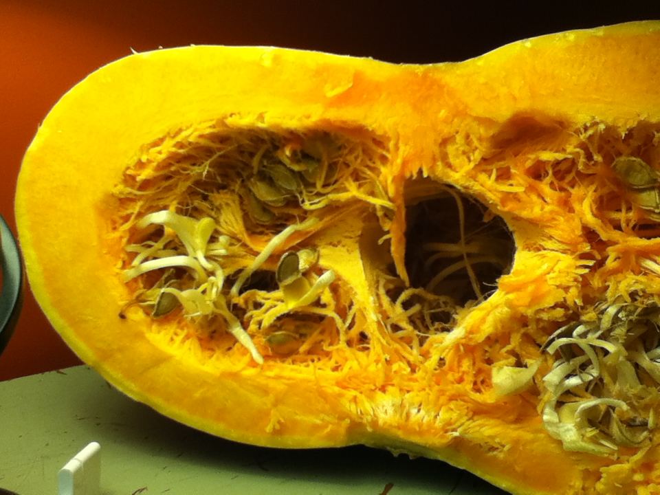 Since November, our living room has been accented by a large, attractive pumpkin from Riverland Farm. It’s slightly flattened shape and tan color has earned it the variety name “cheese pumpkin” since it resembles a large wheel of cheese with a tan rind, not because of any flavor association with cheese. Anyways, this pumpkin has been sitting quietly in our wood-stove heated living room all winter, appreciated as decor as much or perhaps more than food. It was not treated with the usual “keep in a cool, dry location” storage advice for winter squash.