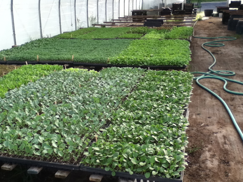 Here are yet another series of seedlings for fall greens at Picadilly, among the last to leave the greenhouse as transplants this year, hardy enough to grow outside well into the Fall. Some greens, like spinach, will soon be seeded either in the greenhouse (“high tunnel”) or seeded in the field and covered with “low tunnels” and harvested in the winter. They’ll grow as much as they can until the days get too short, and then they’ll be in a holding pattern, staying fresh in the soil until picked.
