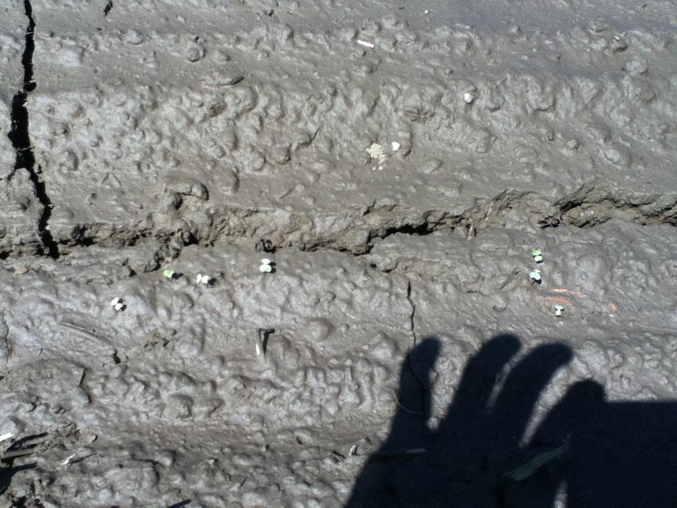 A couple of weeks ago (thought you’d hardly know it now), was one of those crazy storms pouring buckets of water (3 inches in a morning) on the Pioneer Valley. These storms seem to be becoming a regular part of our summers in New England and our soils and plants had better know how to take them. In the photo, here are some purple top turnip seedlings holding on steadily after the deluge that had puddled up the fields. Fortunately, Riverland’s soils drain relatively well.